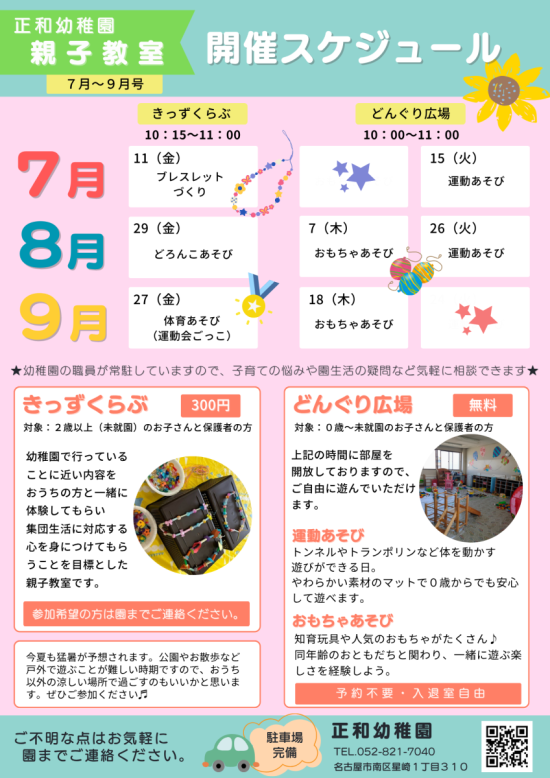 きっずくらぶ・どんぐり広場 7月~9月開催スケジュール 2025/06/26 きっずくらぶ7月~9月のご案内です。 開催スケジュール、詳しくはこちら↓↓ 暑い日が続き、公園などお外遊びが難しい時期になってきました。 涼しいお部屋で月齢の近いお友だちといっしょに遊びませんか? ご参加お待ちしております♪ 【注】きっずくらぶは予約制です。前日まで受け付けていますので、お気軽に園までご連絡ください。